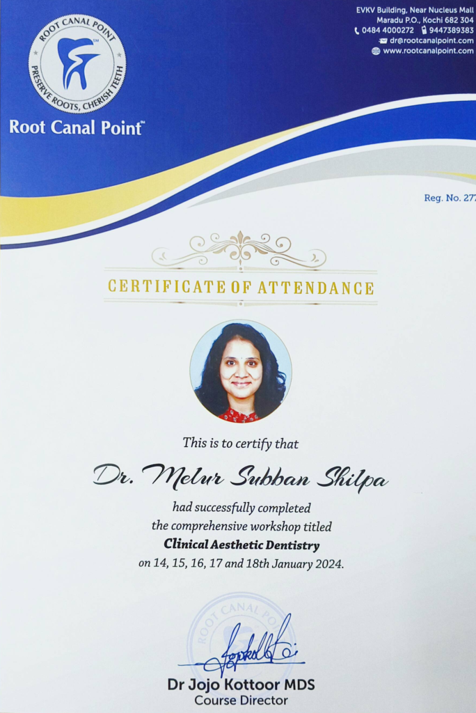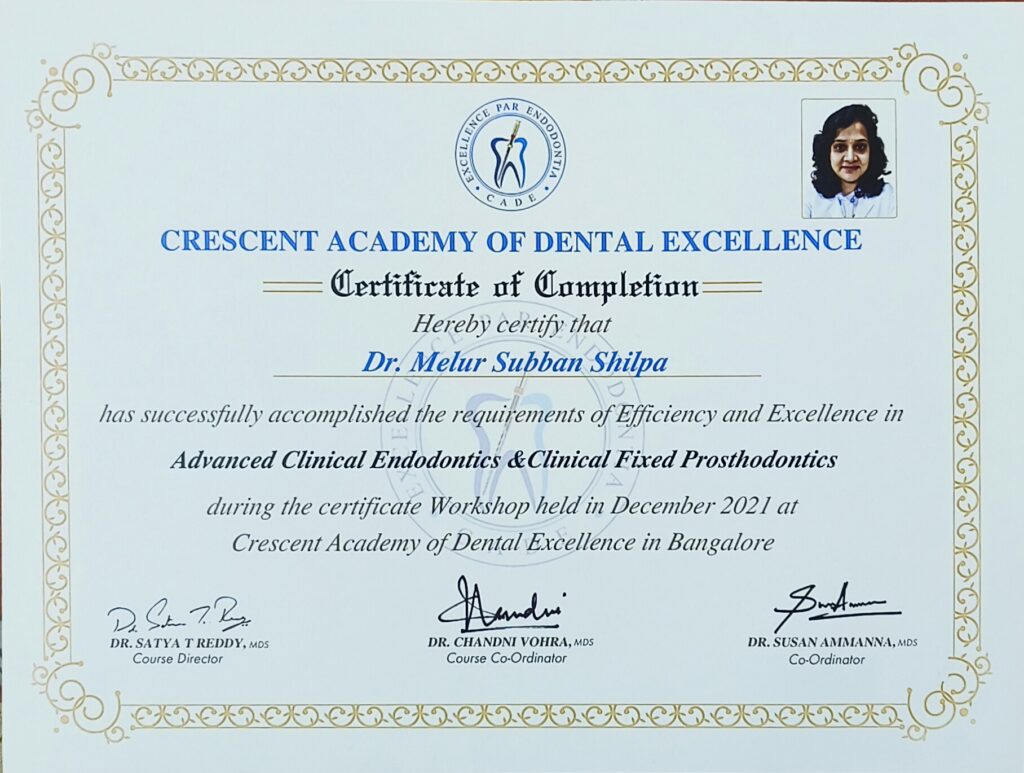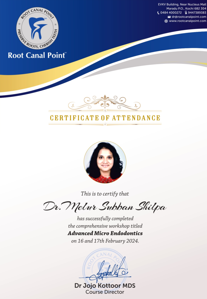 Dr. M.S.Shilpa is a dental surgeon in Bangalore expertised in the field of General Dentistry, certified in Root Canal and Aesthetic Dentist. She graduated from Vivekananda Dental College for Women, Erode. She has completed certified course in Advanced Clinical Endodontics and Clinical Aesthetic Dentistry. She strives to build lasting relationships with patients, helping them achieve optimal oral health and a confident smile. She is a dedicated dentist committed to providing exceptional dental care to patients of all ages. She remains up-to-date with the latest developments in dental technology and methodologies. She provides personalized treatment plans tailored to each patient’s unique needs and goals. By actively seeking out opportunities to expand her knowledge and skills, Dr. M.S.Shilpa ensures that she can offer patients the most advanced and effective treatments available.